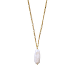 A luminous freshwater stick pearl is hand-wrapped into a graceful pendant and suspended from a stunning, shimmery 14kt gold-filled figaro chain, pairing beautifully with Sand + Salt’s matching Nerina Earrings.