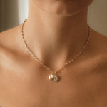 Both charms hang freely on a stunning 15.5" gold-filled dapped long-and-short chain with a 2" extender.
