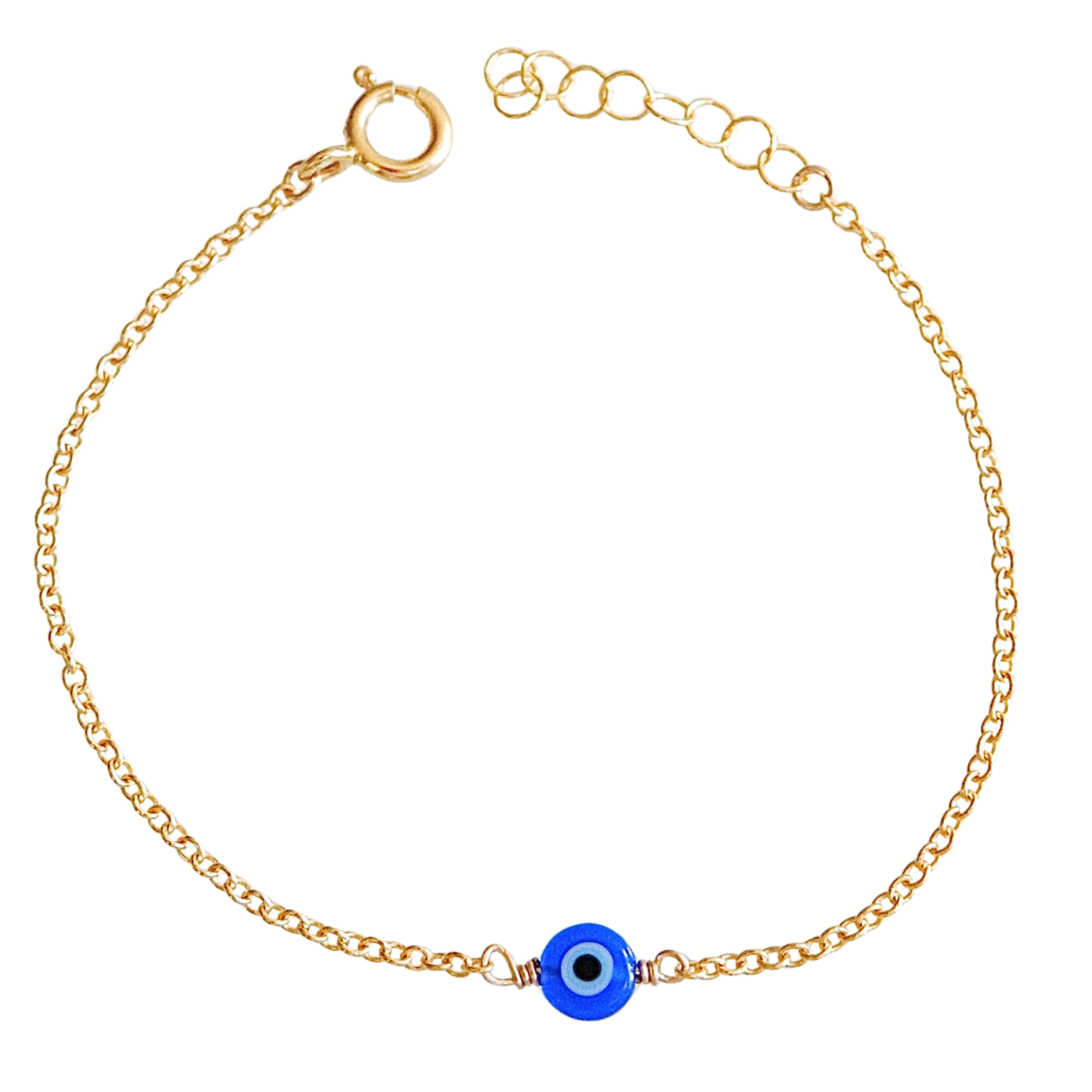 This bracelet features a glass 'evil eye' bead, wire-wrapped onto shimmering gold-filled chain.
