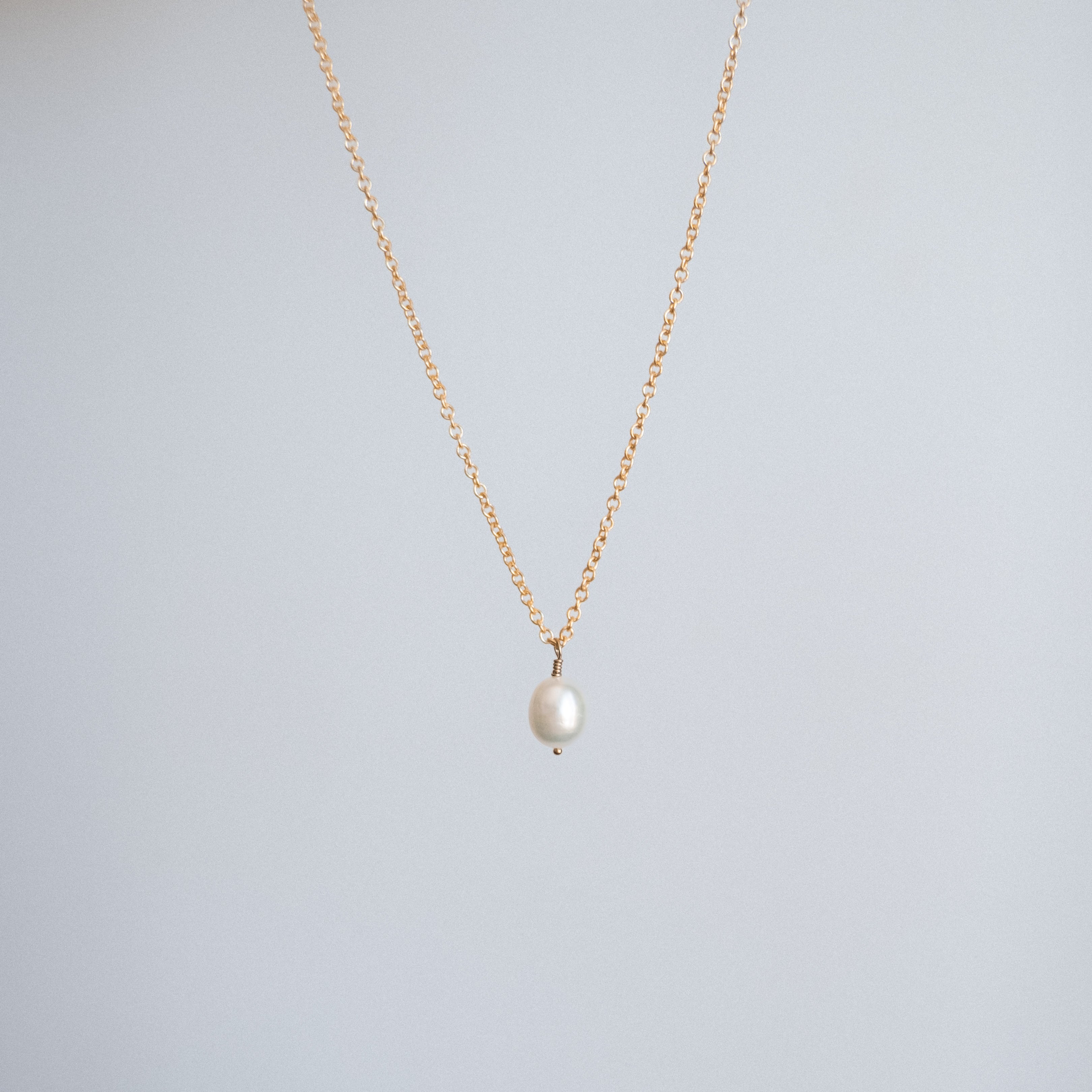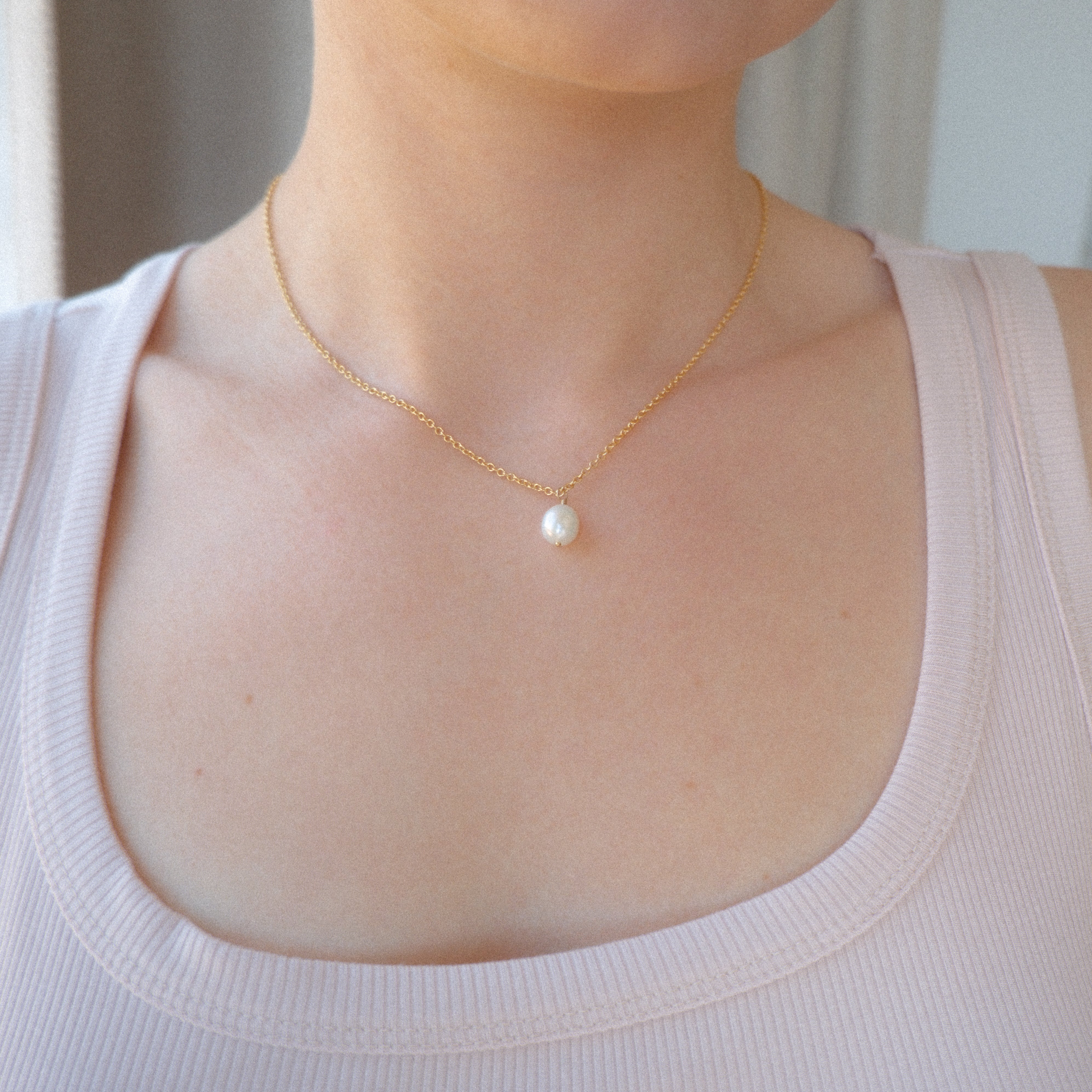 This dainty necklace features a stunning freshwater pearl hand-beaded onto a gold-filled chain. Each necklace is 16 inches long and has a 2-inch extender chain.