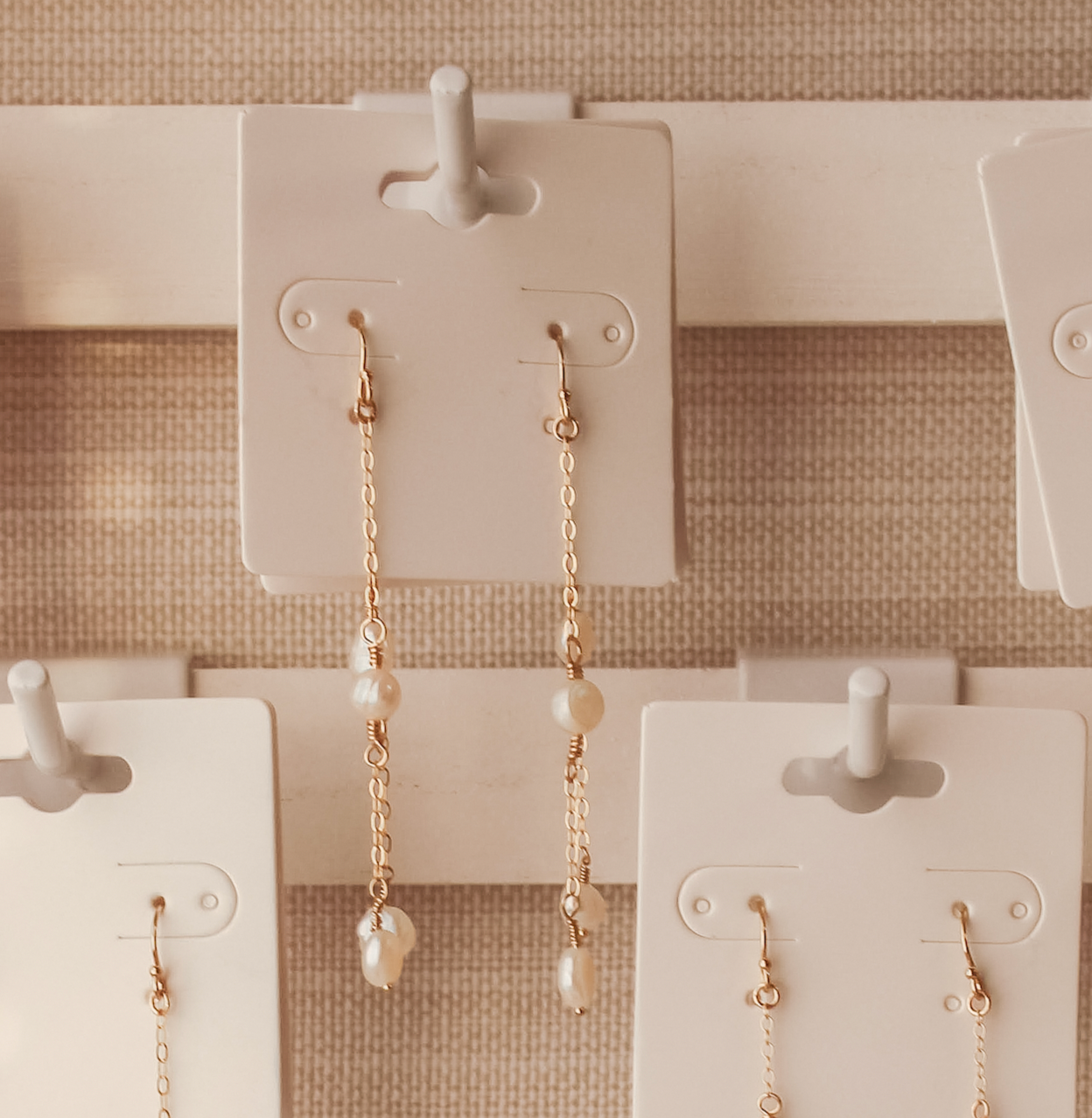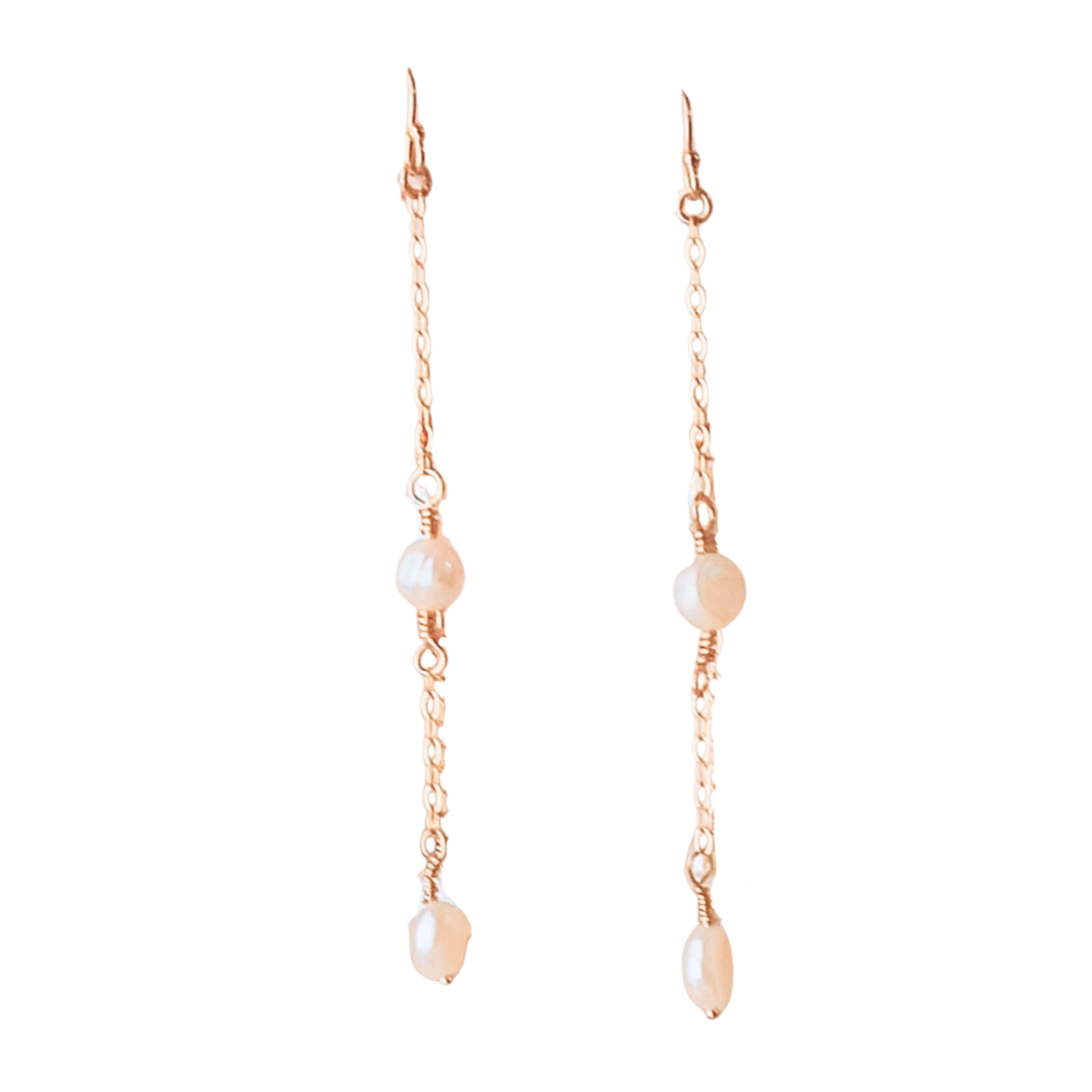 The elegant Serena earrings feature shimmery gold-filled oval chain adorned with dainty freshwater pearls, perfect for a refined and graceful look.