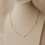 sand + salt pearlfect necklace on jewelry display bust, gold-filled and freshwater pearl necklace