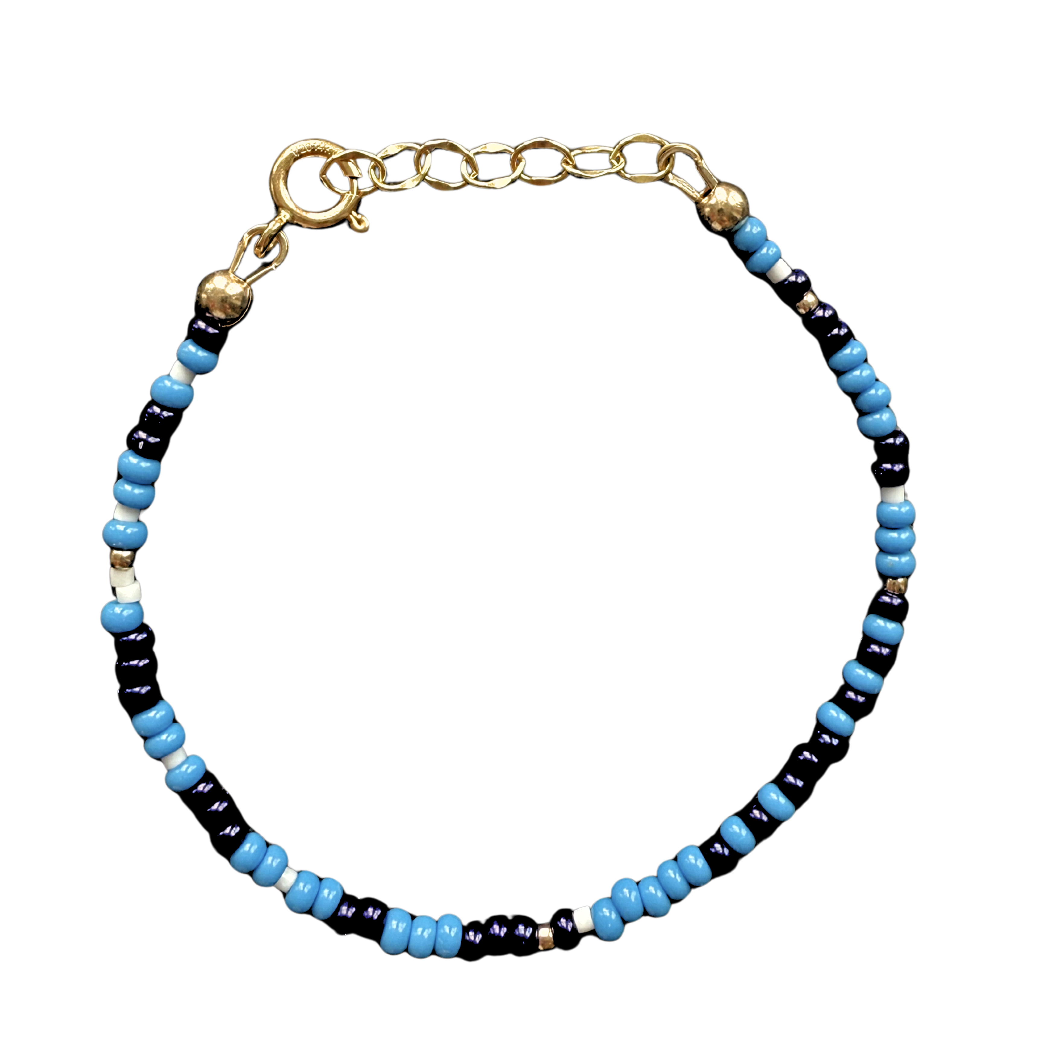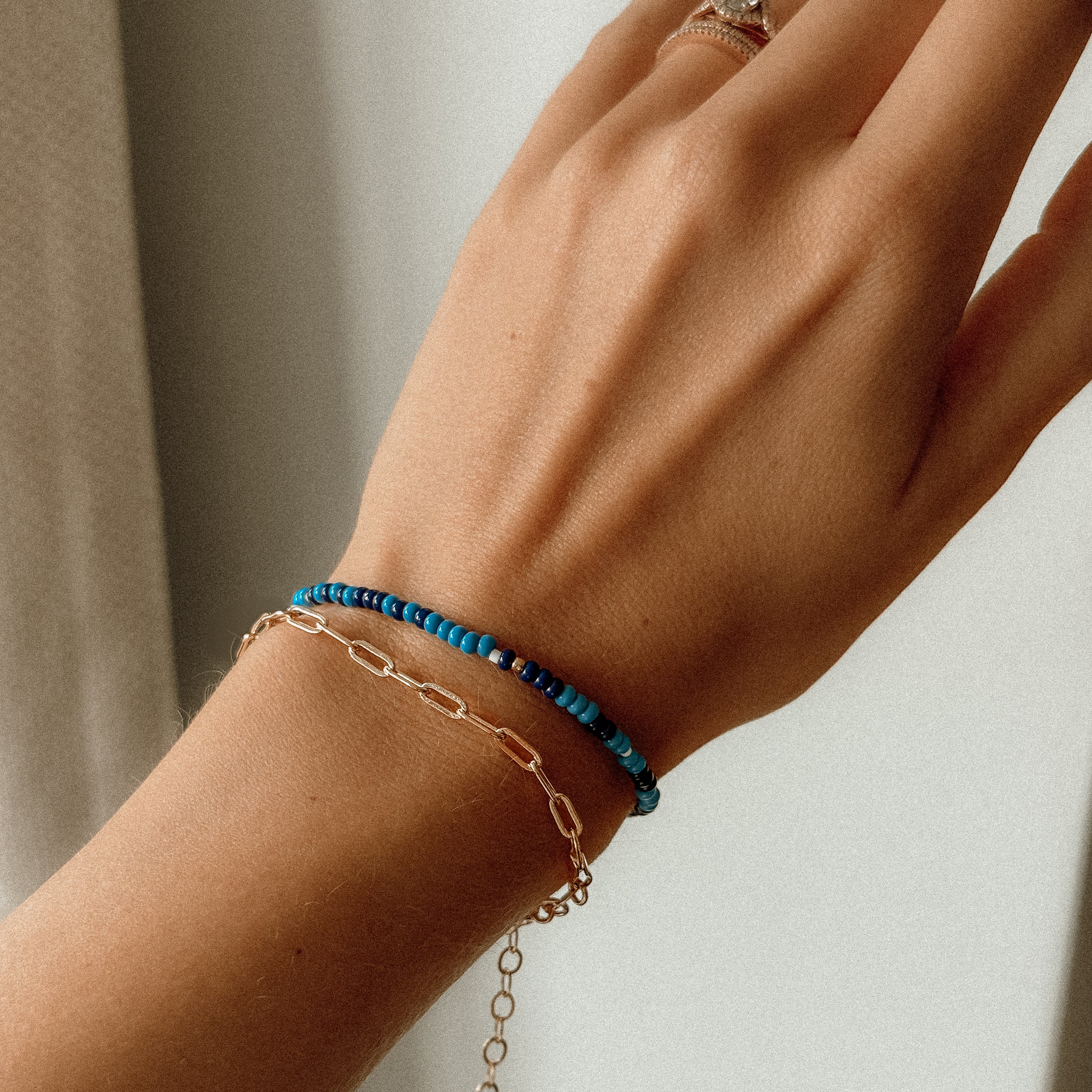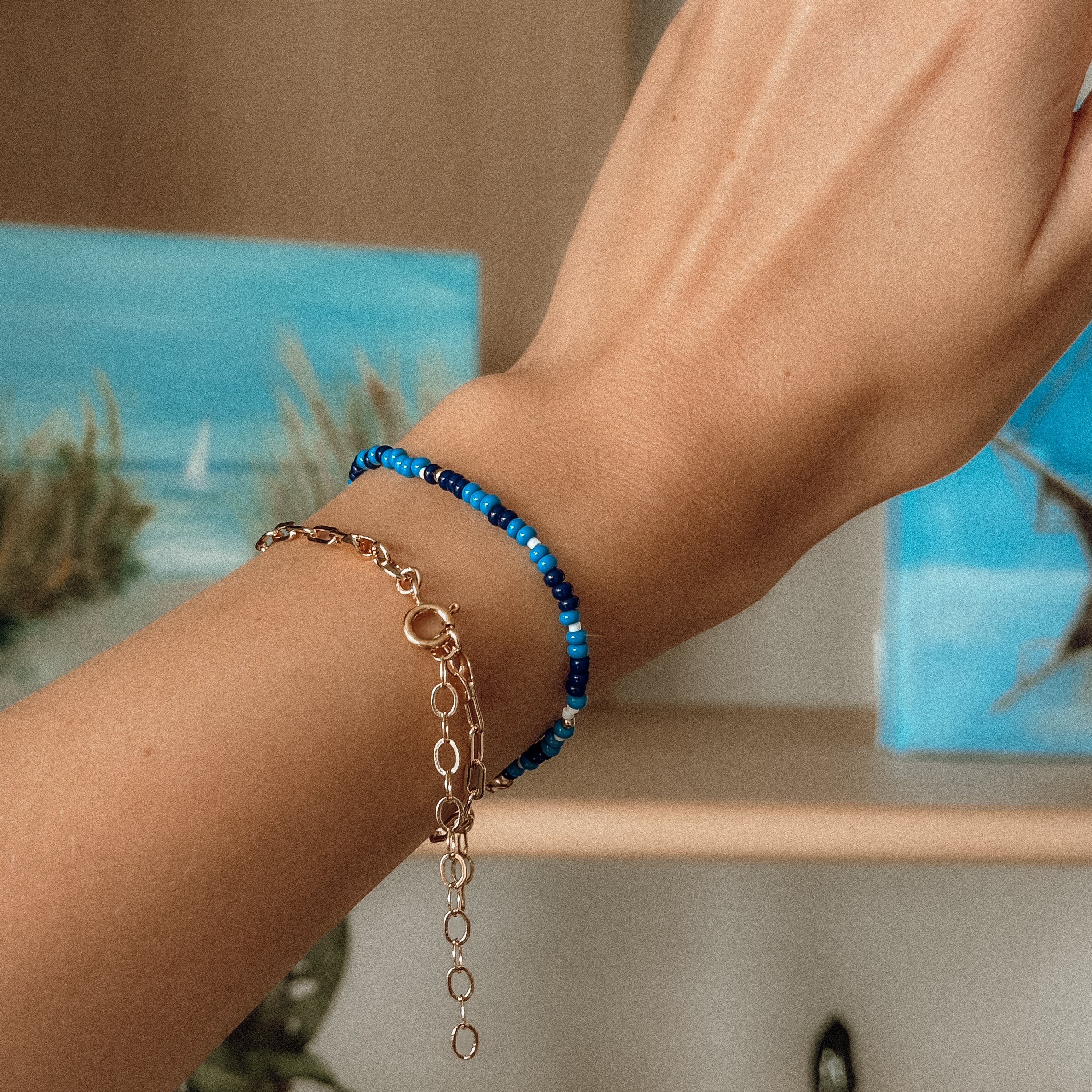 Inspired by the shifting blues of the Aegean and Mediterranean seas, this bracelet adds a vibrant touch of coastal color to your stack. Hand-strung with beautiful seed beads, its playful yet refined design is meant to evoke the sunlit sparkle of clear waters.