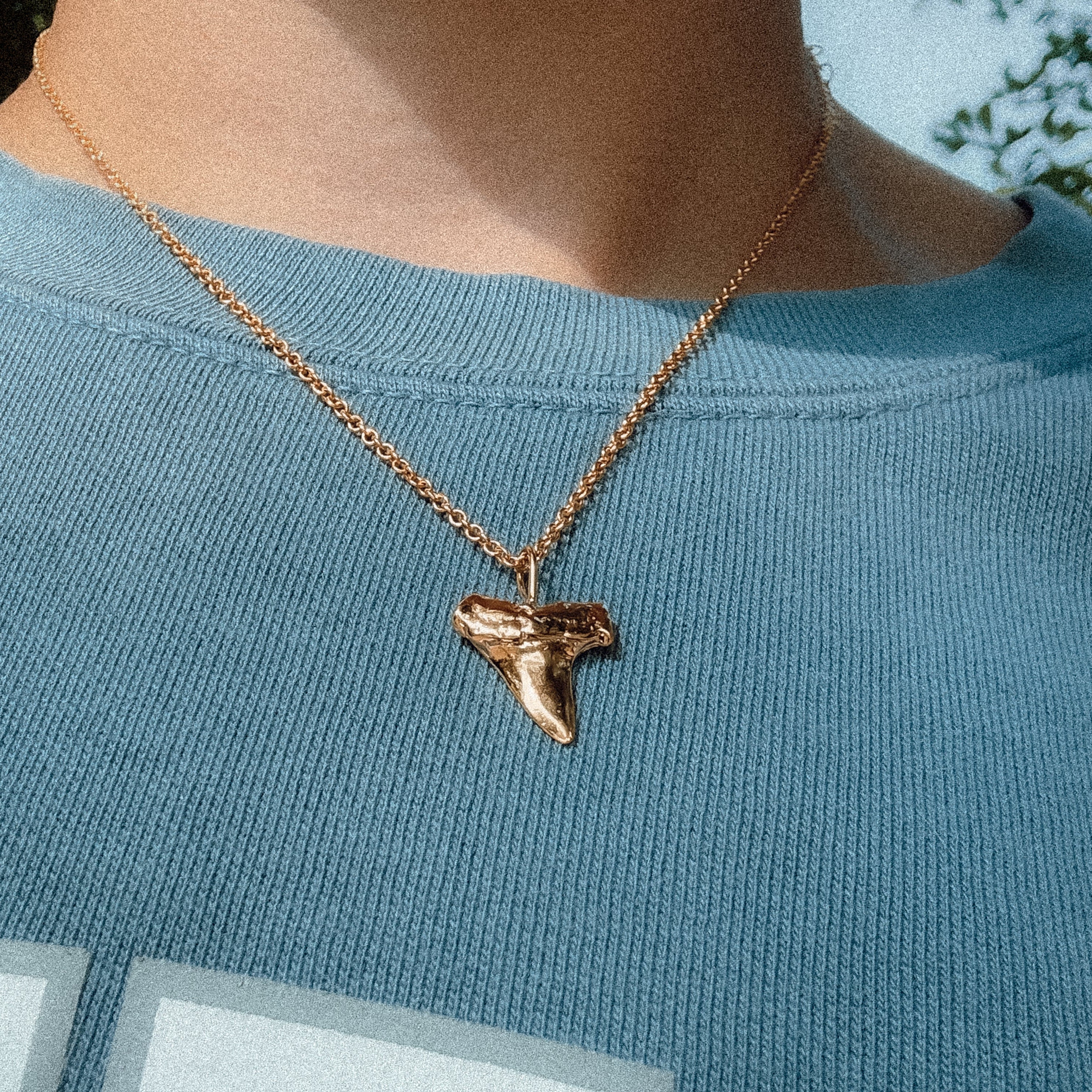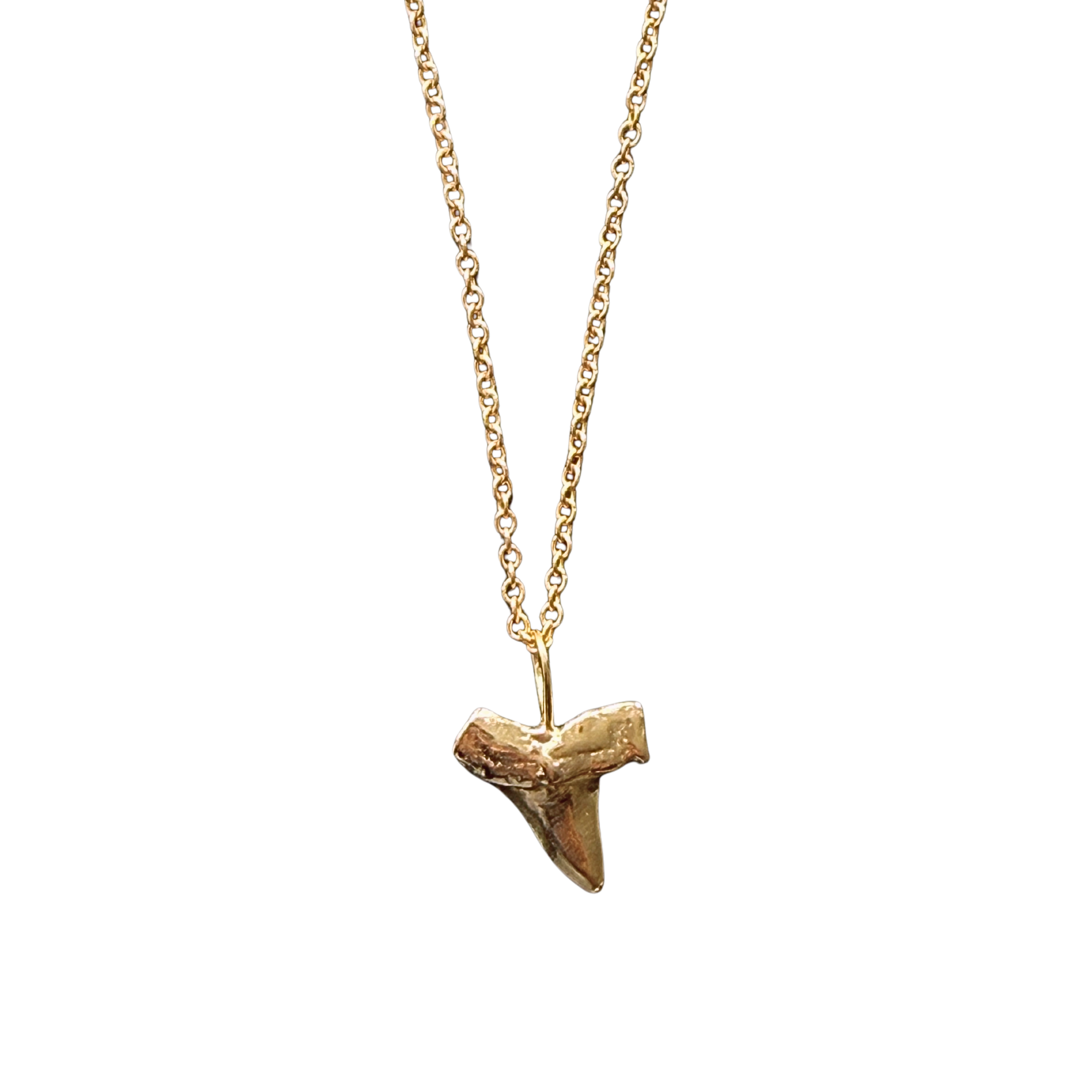 A symbol of strength, resilience, and the sea’s enduring spirit, this shark tooth charm shines as a bold golden talisman.